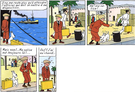 TINTIN PENSE PERDRE SA VALISE QUAND UN PASSANT LE CROISE AVEC UNE MALLETTE IDENTIQUE